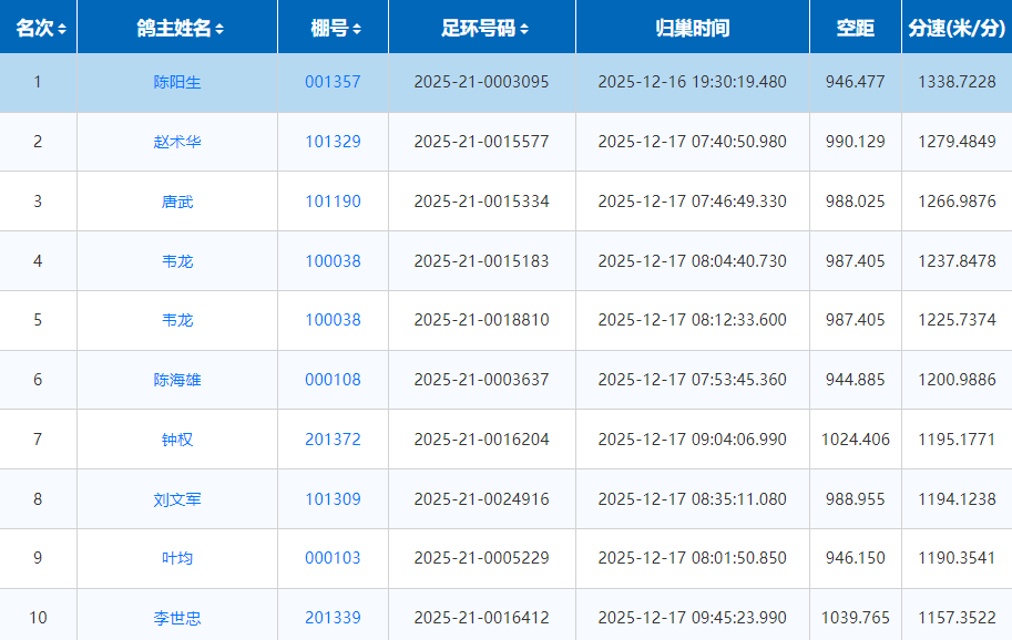 值得一提的是,鸽友韦龙一连报进两羽,将第四名和第五名收入囊中,环号分别是2025-21-0015183、2025-21-0018810,实际空距987.405公里,分速为1237.8478米/分、1225.7374米/分,实力不俗。