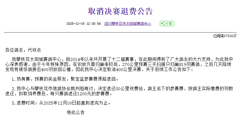12月15日,四川攀枝花市太阳城赛鸽中心宣布取消决赛并退费。