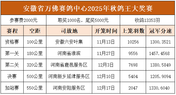 安徽万佛赛鸽中心2025年秋决赛301—400名