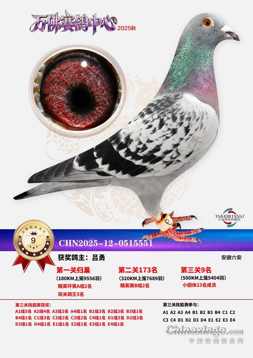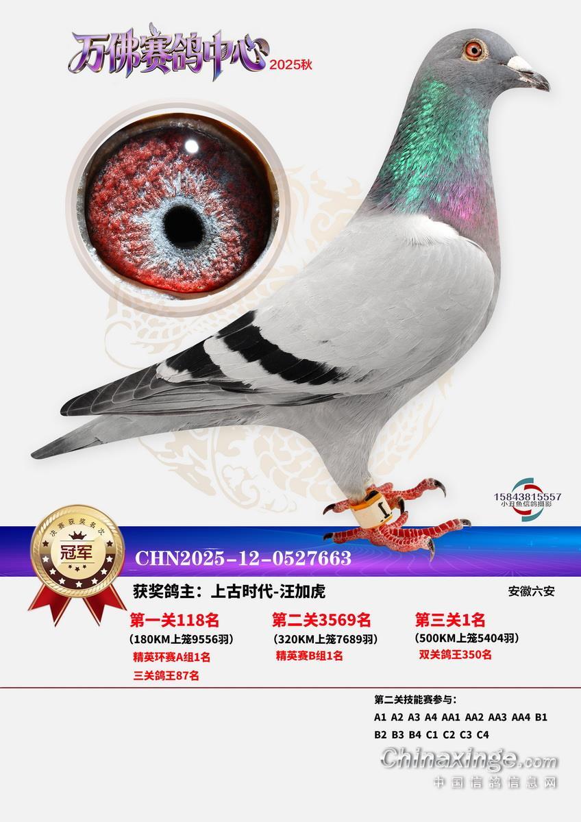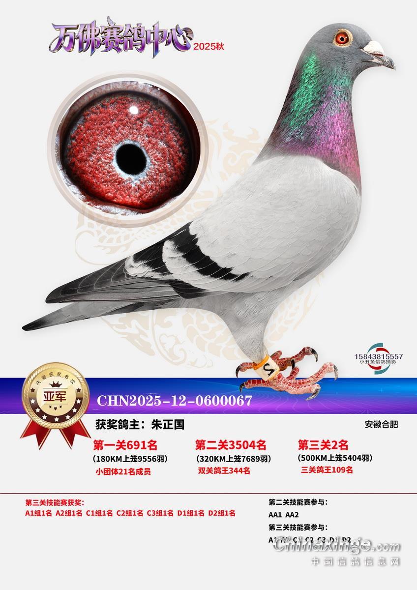 一流管理,三公竞赛,已经有十余年办赛经验的安徽省万佛赛鸽中心,在2025年秋季大奖赛中,交出了一份让鸽友们满意的答卷。关关高分速,场场高归巢。万佛小将们的基本功,在一场一场的训练和比赛中练的扎扎实实。三关战罢,0550永阳-吕强的12-0749311灰实力强劲,三关名次分别为56名、315名、5名,不仅在决赛挺进前十,更是获得了三关鸽王冠军,可喜可贺!鸿冠鸽苑-李春平的12-0169008灰,双关成绩为46、56名,获得双关鸽王冠军。决赛冠军是上古时代-汪加虎的12-0527663,飞行分速1205.9094米/分。