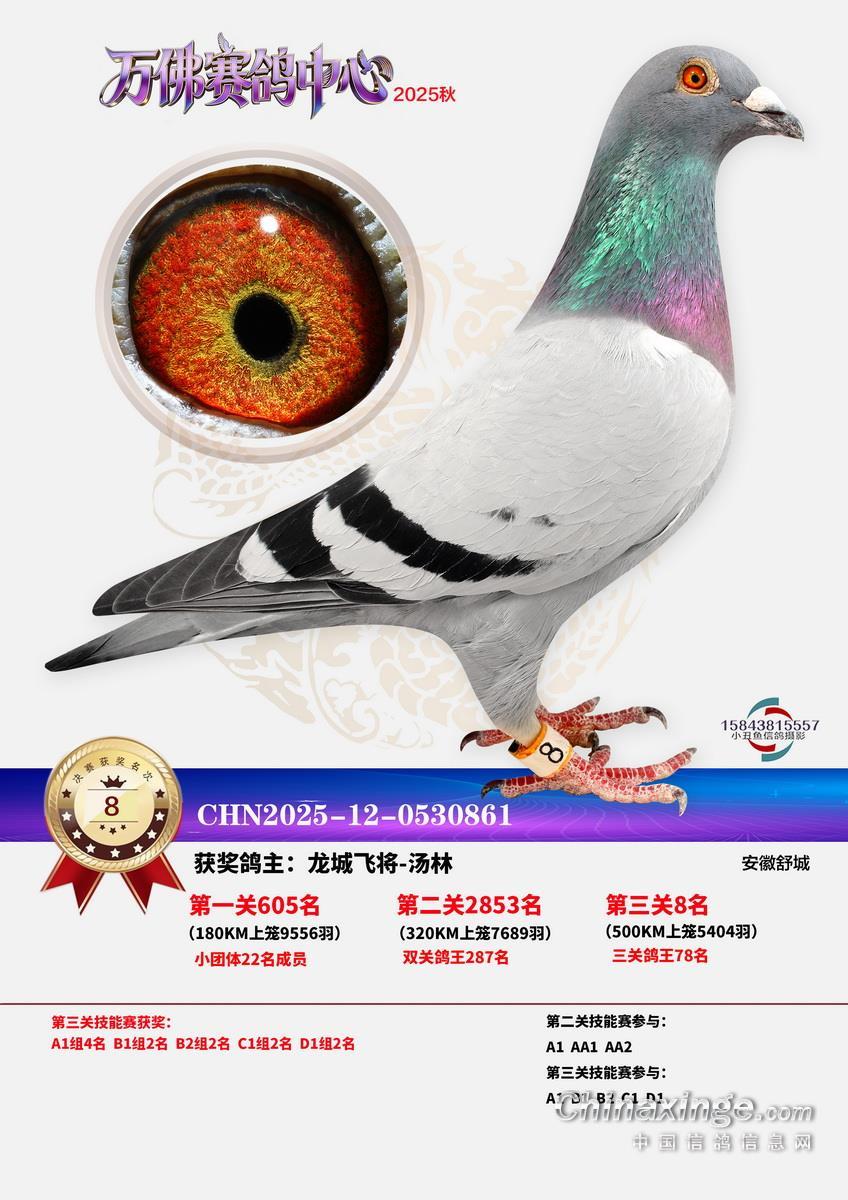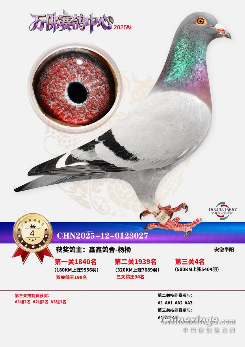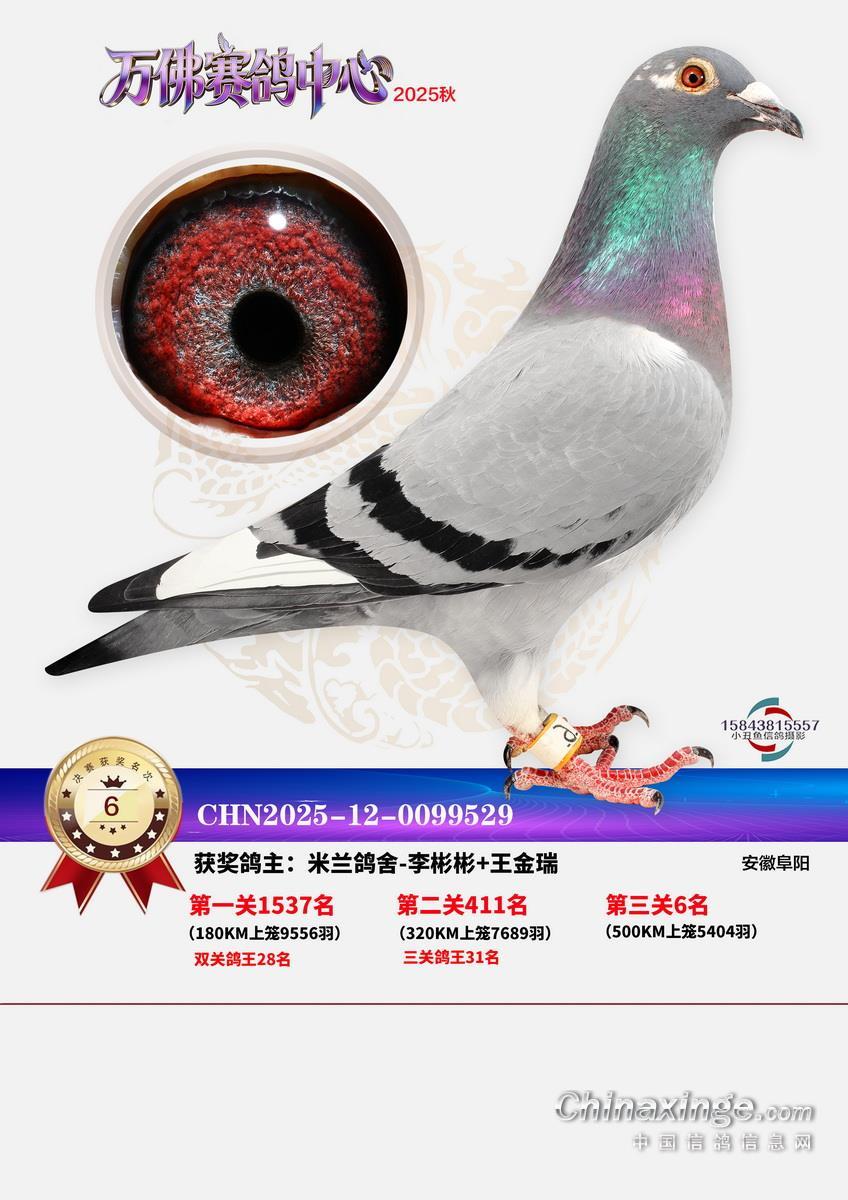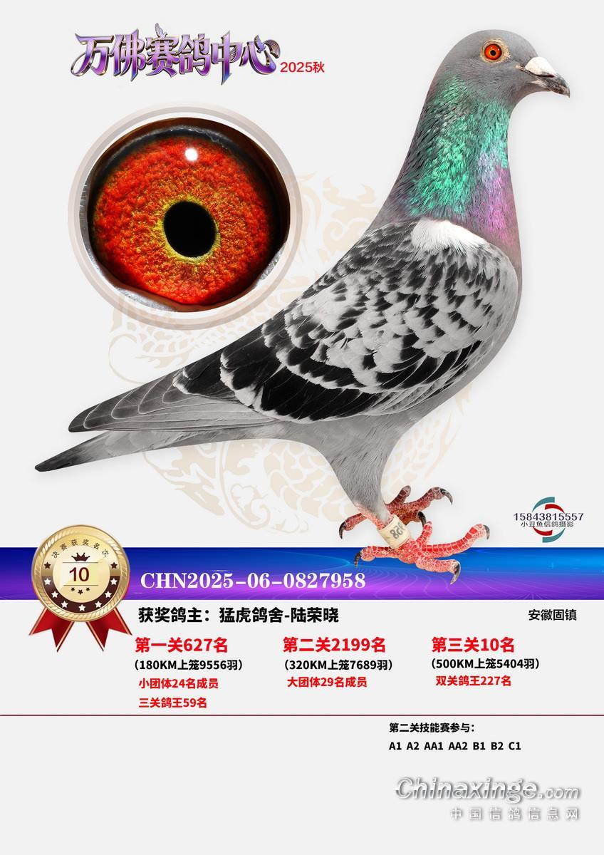 一流管理,三公竞赛,已经有十余年办赛经验的安徽省万佛赛鸽中心,在2025年秋季大奖赛中,交出了一份让鸽友们满意的答卷。关关高分速,场场高归巢。万佛小将们的基本功,在一场一场的训练和比赛中练的扎扎实实。三关战罢,0550永阳-吕强的12-0749311灰实力强劲,三关名次分别为56名、315名、5名,不仅在决赛挺进前十,更是获得了三关鸽王冠军,可喜可贺!鸿冠鸽苑-李春平的12-0169008灰,双关成绩为46、56名,获得双关鸽王冠军。决赛冠军是上古时代-汪加虎的12-0527663,飞行分速1205.9094米/分。