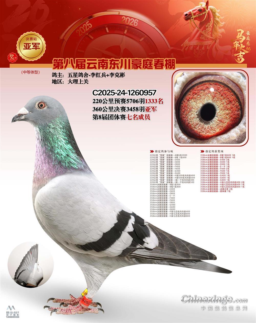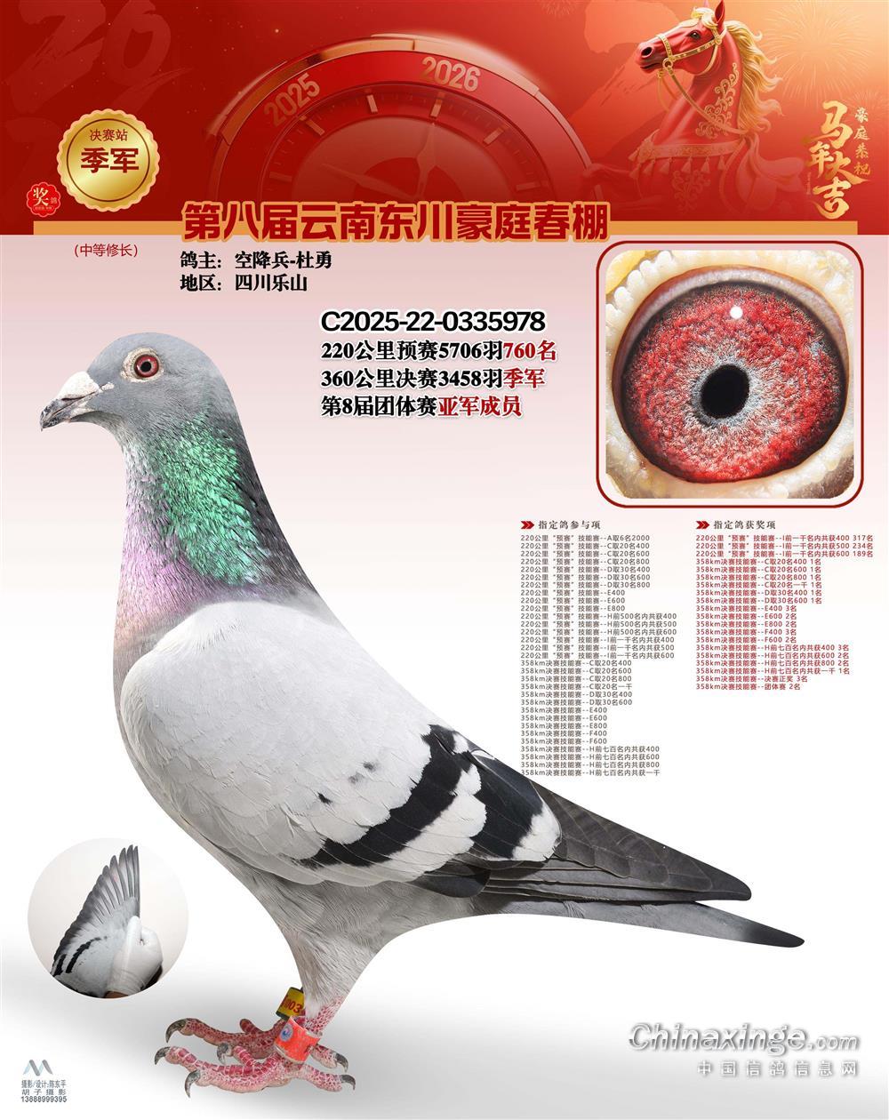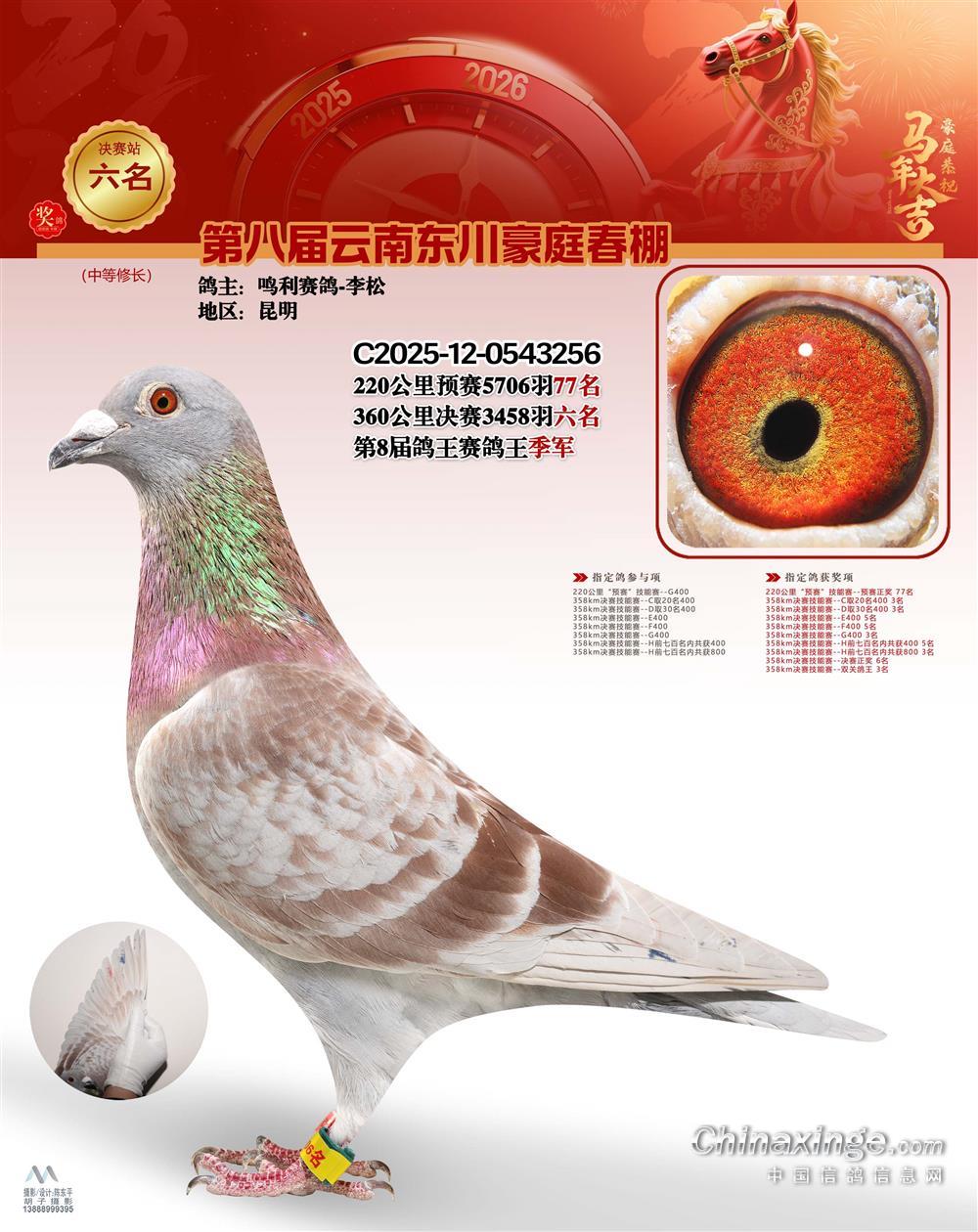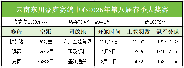 云南东川豪庭2026年第八届春赛,给鸽友交上了一份漂亮的成绩单。都说春赛难飞,云南春赛难度更甚:地形多变复杂、崇山峻岭加上天敌环伺,每一场训练都是一次冒险。但即便在这样的情况下,东川豪庭的小将们还是交上了好成绩:两关比赛场场高分速,预赛冠军最高达1815米/分,这都是不断训练出来的结果。收鸽后从0公里训放到120公里,豪庭小将们每一场都全力以赴。最终,决赛超千羽归巢,冠军李伟+李千林名下雨点2025-22-2557678,飞行分速1629.8966米/分,成为本场赢家。欣欣向荣-邹永童的2025-24-0704714灰花,以一关3名、二关29名的好成绩,拿下了双关鸽王冠军,祝贺!
