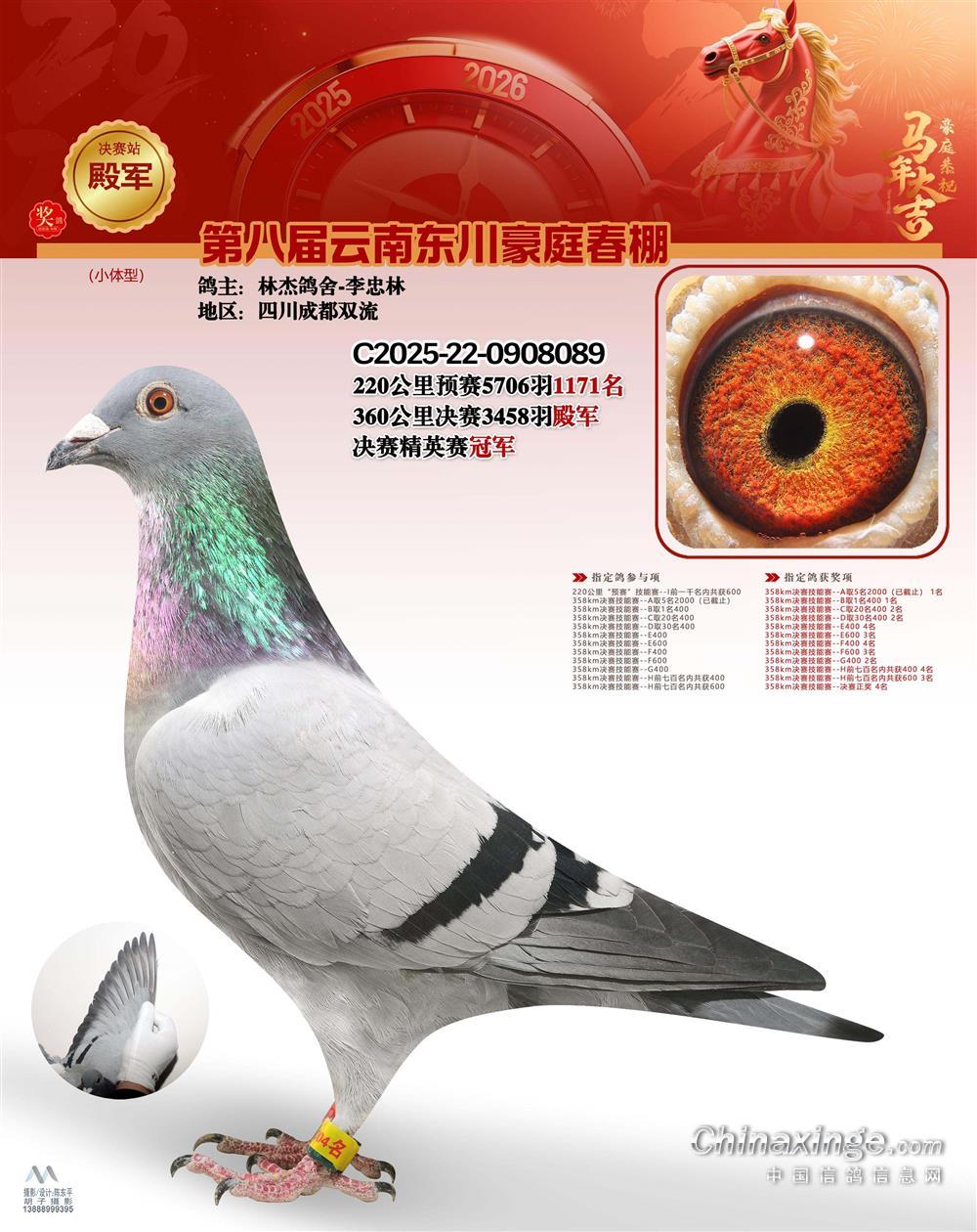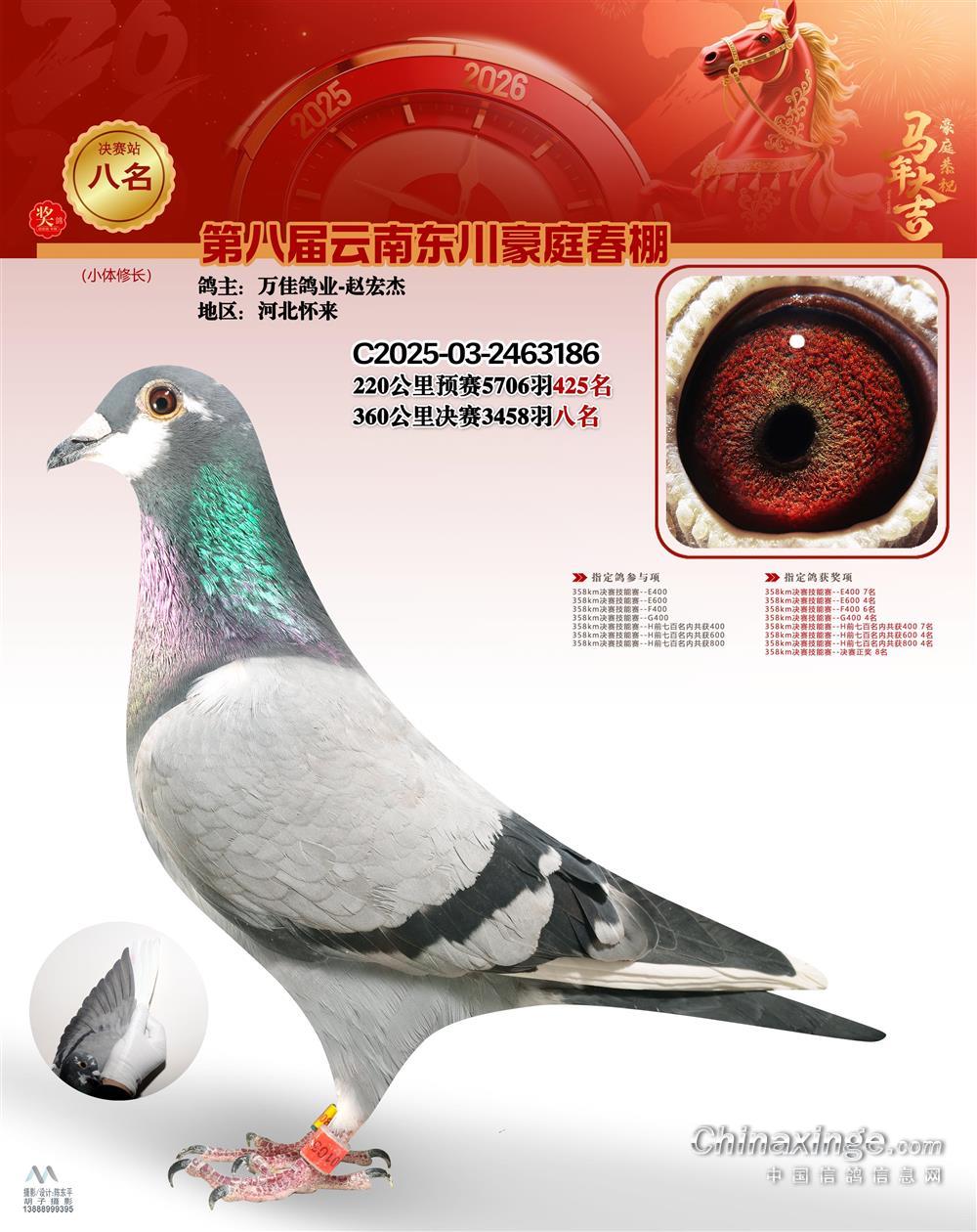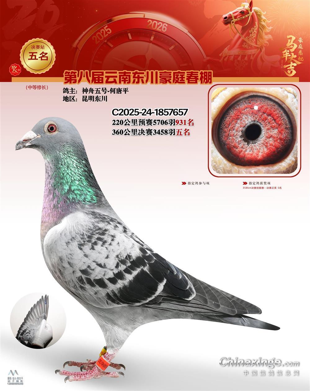 云南东川豪庭2026年第八届春赛,给鸽友交上了一份漂亮的成绩单。都说春赛难飞,云南春赛难度更甚:地形多变复杂、崇山峻岭加上天敌环伺,每一场训练都是一次冒险。但即便在这样的情况下,东川豪庭的小将们还是交上了好成绩:两关比赛场场高分速,预赛冠军最高达1815米/分,这都是不断训练出来的结果。收鸽后从0公里训放到120公里,豪庭小将们每一场都全力以赴。最终,决赛超千羽归巢,冠军李伟+李千林名下雨点2025-22-2557678,飞行分速1629.8966米/分,成为本场赢家。欣欣向荣-邹永童的2025-24-0704714灰花,以一关3名、二关29名的好成绩,拿下了双关鸽王冠军,祝贺!