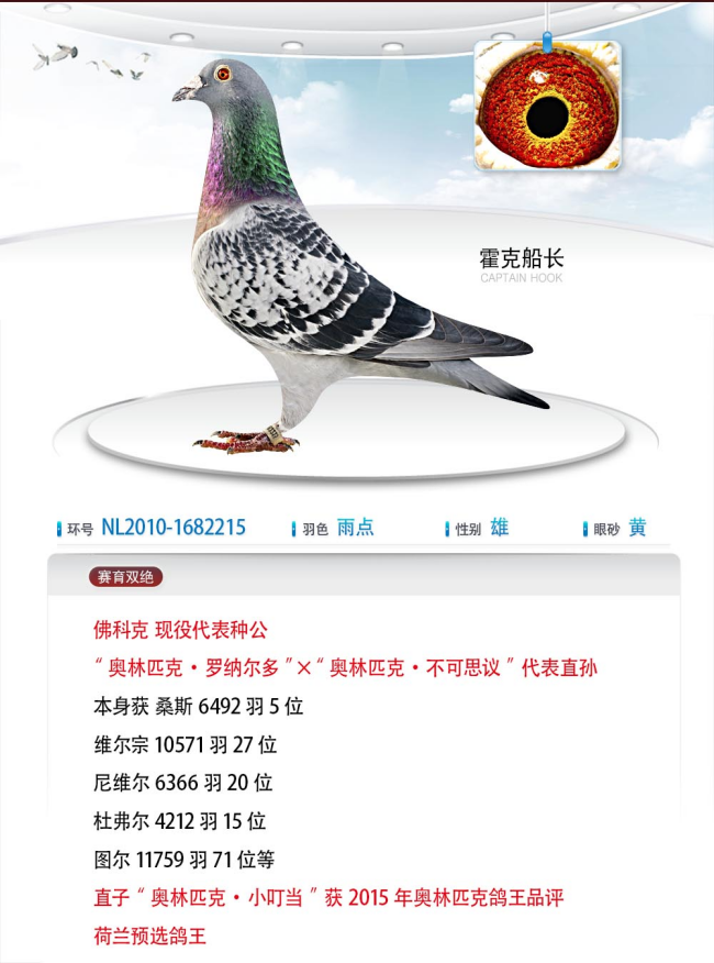 父亲是魔法家族超级种公霍克船长直子×直女近亲作育,同时融入了全能奥林匹克鸽索朗格的血脉。魔法家族后代战绩显赫,25年秋斩获阳光大棚双关鸽王冠军、区域冠军、决赛500公里季军,母亲是新哈利黄金。