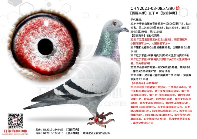 父系出自百丽高手直子百丽荣光,与新484配对雌波治神鹰;百丽高手一脉战绩彪炳,获21年爱翔第三关5名,精英赛冠军。母亲是幼鸽速度鸽王冠军超级里奥与新484直女的结合,新484家族近年来收获皓翔鸽王冠军、玉溪玉活三关鸽王殿军等。