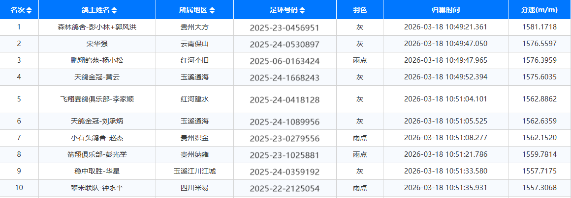 截至开笼第二日上午9时30分,仅归巢2181羽,归巢率48.8%。其中,森林鸽舍彭小林+郭风洪组合麾下一羽2025-23-0456951灰鸽,分速为1581.1718米/分,获得冠军。鸽友宋华强的2025-24-0530897灰鸽,分速1576.5597米/分,获得亚军。季军则被鹏翔鸽苑-杨小松的一羽2025-06-0163424雨点拿下,分速1576.3959米/分。比赛直播