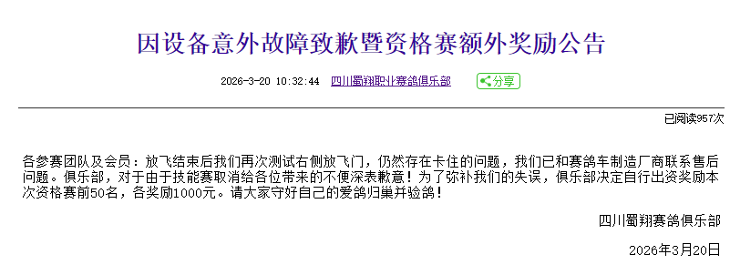 上午10点半,俱乐部发布致歉公告。称已和赛鸽车制造厂商联系售后问题,为了弥补失误,俱乐部决定自行出资奖励本次资格赛前50名,各奖励1000元。