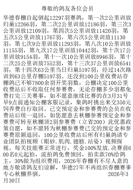 “华德春棚自起训共12297羽赛鸽……经过14次路训到63公里存棚5197羽。还没到100公里收费站,存棚鸽已不够7800余羽开奖羽数。公棚决定100公里收费站后不收取任何参赛费,无论存棚多少羽都免费打完三关赛事,如不愿意继续比赛的,在3月31号早9点前通知公棚客服记录,集鸽时挑出来交350元饲养费自行取回。”