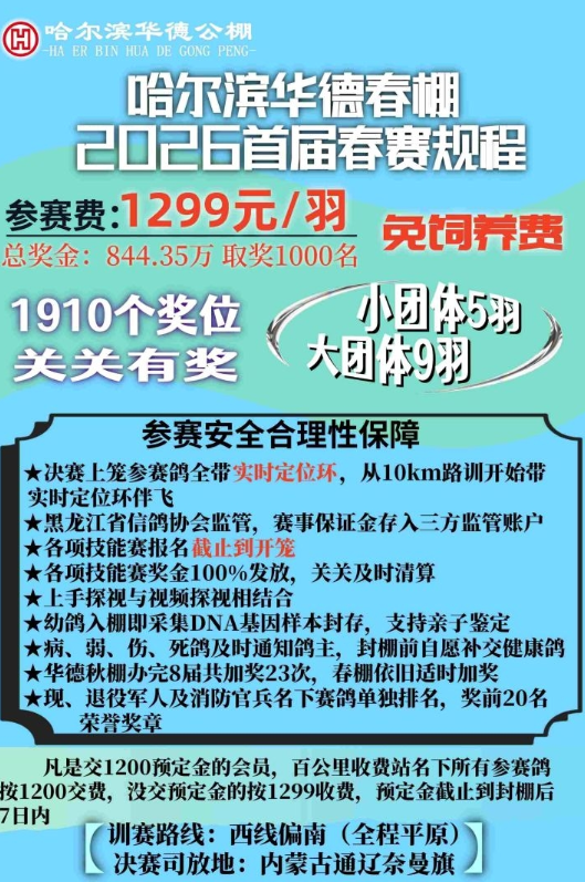 据悉,2026年是该棚首届春赛,收鸽16092羽,参赛费1299元/羽(免饲养费)。本届设三关正赛,500-530公里决赛取奖1000个名次,前三名依次奖励18万元、13万元、8万元,尾奖3千元。
