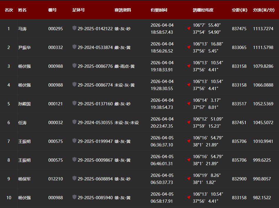 漫长的等待后,归巢的捷报终于在傍晚时分传来。18时58分57秒,鸽友马涛的一羽29-2025-0142122,砂眼灰色雄鸽强势报进,空距837.475公里,分速1113.7274米/分,凭借更远的空距和更快的分速,一举夺得本次大赛的冠军宝座。