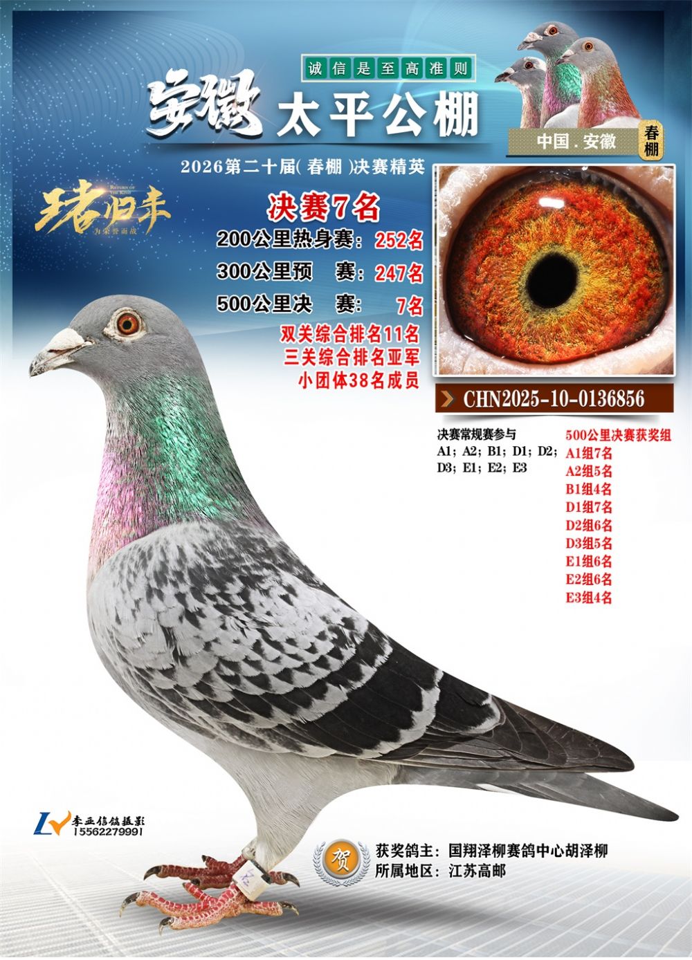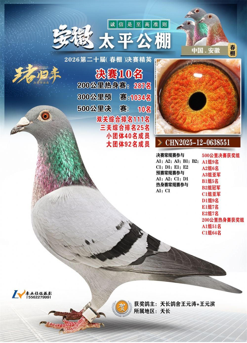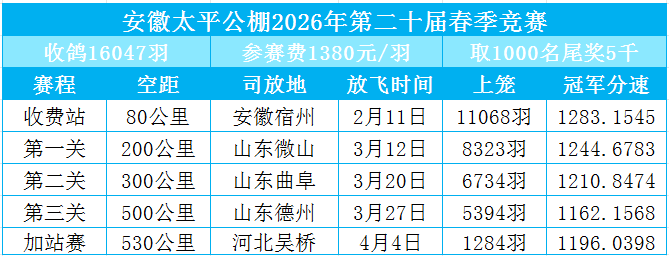 二十载峥嵘岁月,铸就精英品牌;二十年砥砺前行,见证王者归来。2026年,安徽蚌埠太平公棚第二十届春赛于4月初圆满落下帷幕,奏响蓝天凯歌。本届赛事群英荟萃,共收鸽16047羽,历经80公里收费站、200公里首关、300公里二关,直至500公里决赛决战苍穹,最终两千多羽精英凯旋。随后,530公里加战赛挑战再升级,共计四百羽悍将顽强归来。