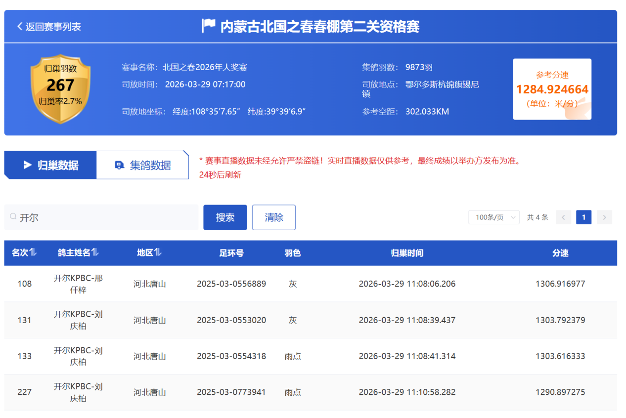 盖比闪电持续领跑,多羽战将齐登高位,期待使翔闪电后裔的鸽友春赛展翅,捷报频传!