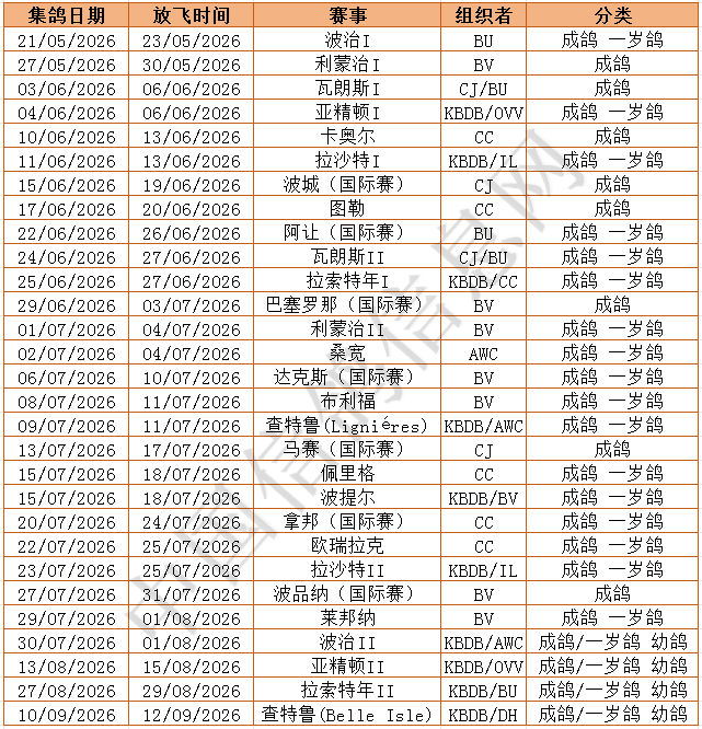 在为期三个半月的赛程中,部分时段将安排一周双赛甚至三赛的密集赛程。欧洲夏季赛鸽盛宴即将开启,让我们共同期待各路豪强在蓝天赛场上一争高下!