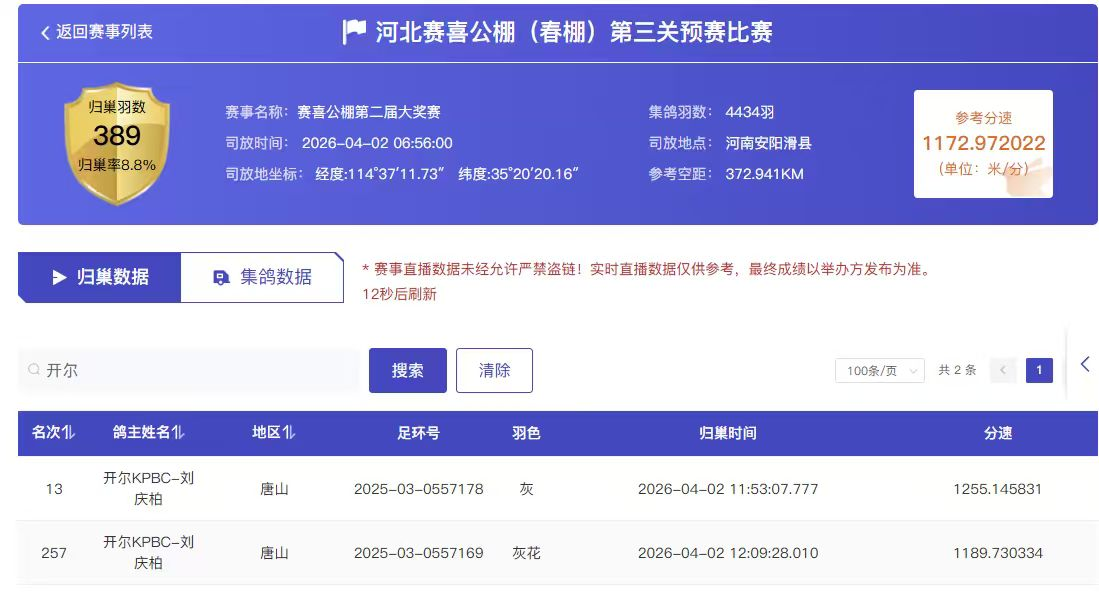 在4月2日举办的河北赛喜公棚预赛中,开尔奶酪血统鸽斩获第13、257名等好成绩!