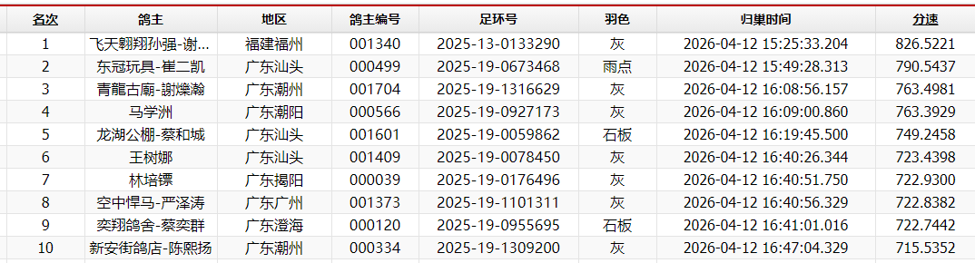 15:25,突然一羽赛鸽打破寂静,是来自福建福州鸽友,飞天翱翔孙强-谢贤的2025-13-0133290灰率先打钟归巢!飞行分速826.5221米/分,这是毫无疑问的冠军了。它足足领先亚军24分钟,把胜利成果牢牢握在自己手里。不仅如此,鸽主飞天翱翔孙强-谢贤名下还有一羽高位赛鸽,环号2025-13-0050550灰,获得决赛15名。