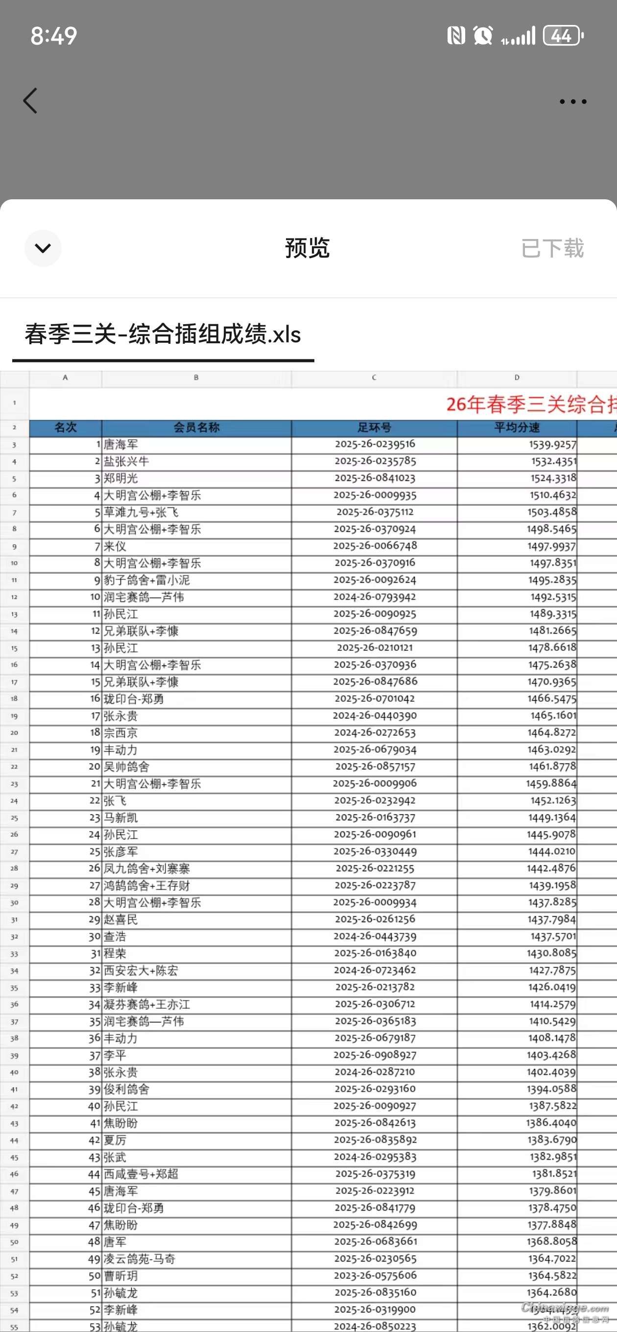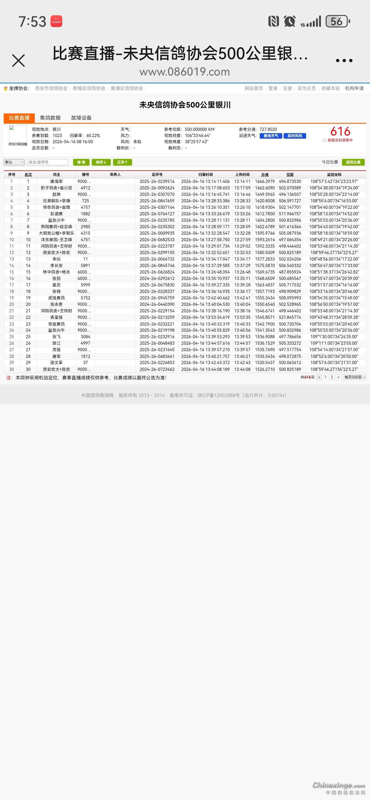 而真正点燃赛场沸点的,是前八名赛鸽的“火箭级”分速:全部突破1600米/分钟!冠军鸽更是以1666.2797米/分钟的分速一骑绝尘,在司放点银川到归巢地的漫漫征途中,以近乎“贴地飞行”的速度完成冲刺,将长距离赛事的速度天花板再度拉升。要知道,信鸽分速每提升100米,都需要体能储备、定向能力与心理素质的多重突破,前八名的集体爆发,无疑是西安信鸽种群质量与训养技术迭代的最佳证明。
