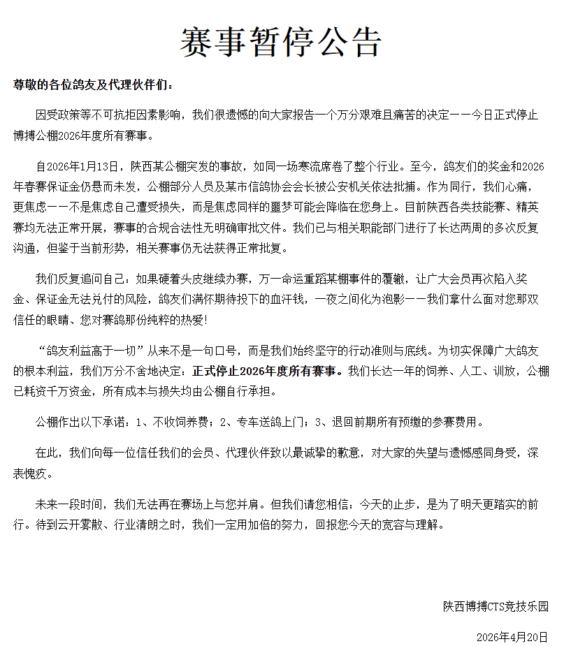公告中提及:“自2026年1月13日,陕西某公棚突发的事故,如同一场寒流席卷了整个行业。至今,鸽友们的奖金和2026年春赛保证金仍悬而未发,公棚部分人员及某市信鸽协会会长被公安机关依法批捕。作为同行,我们心痛,更焦虑——不是焦虑自己遭受损失,而是焦虑同样的噩梦可能会降临在您身上。目前陕西各类技能赛、精英赛均无法正常开展,赛事的合规合法性无明确审批文件。我们已与相关职能部门进行了长达两周的多次反复沟通,但鉴于当前形势,相关赛事仍无法获得正常批复。”为切实保障广大鸽友的根本利益,遂决定正式停止2026年度所有赛事。(点击查看原文)