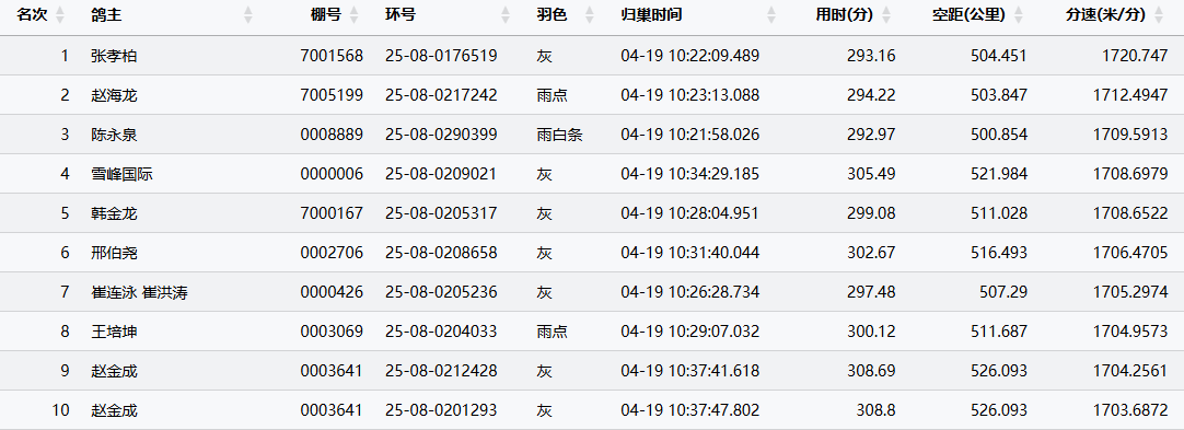 上午10时,比赛开陆续到鸽,小将们归巢之迅速让人惊叹。10时22分09秒,鸽友张孝柏的一羽25-08-0176519灰打钟报到,空距504.451公里,飞出1720.747米/分的超高分速,顺利斩获本关冠军!