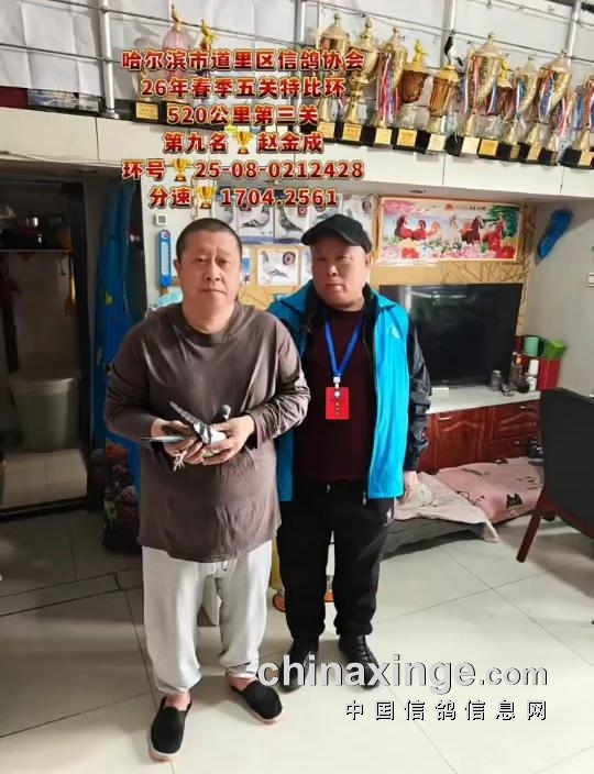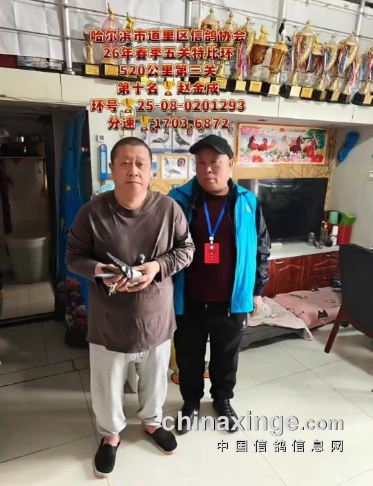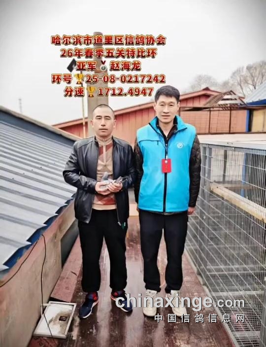 10时23分13秒,鸽友赵海龙的一羽25-08-0217242雨点打钟归来,空距503.847公里,分速1712.4947米/分,获得亚军宝座。