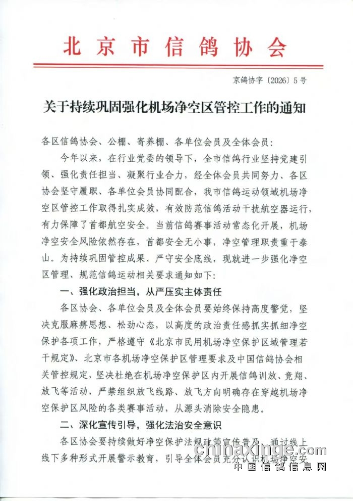 4月21日,北京市信鸽协会发布《关于持续巩固强化机场净空区管控工作的通知》。