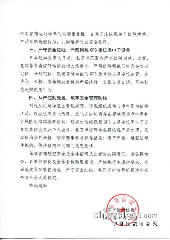 公告内说明:自本通知发布之日起,北京市范围内所有信鸽训放、比赛、竞翔等各类信鸽运动及相关活动中,严禁信鸽佩戴任何具备实时定位、分时定位、轨迹存储功能的GPS及其他卫星定位装置。各协会、公棚、寄养棚及会员须严格执行,全面自查自清,坚决杜绝违规使用行为。