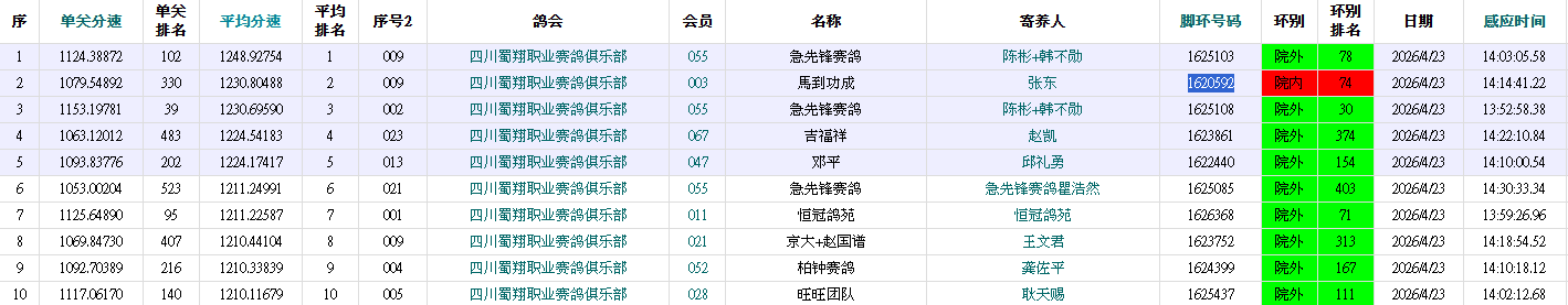 13:31:32,聚缘团队-勇翔+邱礼勇的1621685赛鸽率先归巢,以1205.7643米/分的分速拔得头筹。;13:32:54,杜涛-王贺的1623298赛鸽紧随其后报进,飞出1205.4124米/分的分速,成功斩获亚军;13:31:44,雄起团队-华泰鸽舍苏良东的1623395赛鸽,以1205.3808米/分的分速拿下季军。