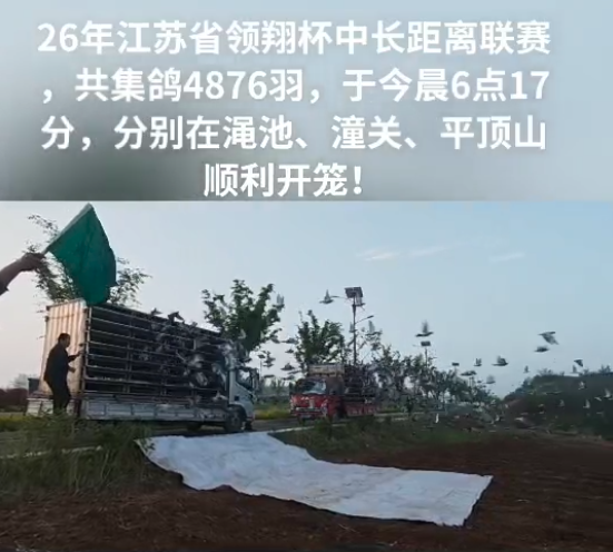 4月26日早6点整,江苏省第二届中长距离联赛开笼。这是一场声势浩大的700公里挑战赛,各市鸽会踊跃参赛,集鸽羽数达到4876羽。因空距原因,司放地分别在渑池、平顶山、潼关开笼。