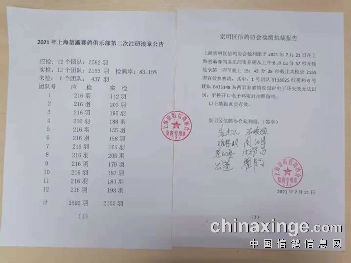 日前,2021年上海堃瀛赛鸽俱乐部四关鸽王大奖赛完成第二次注册登记,7月21日上午8点02分至晚上19点43分,共检录12个团队的2155羽有效赛鸽,有格率为83.15%。