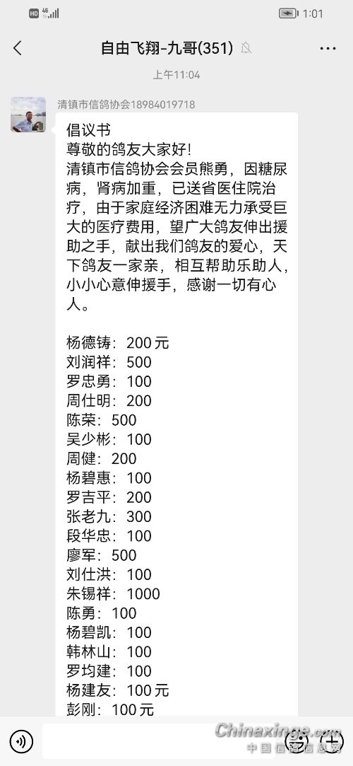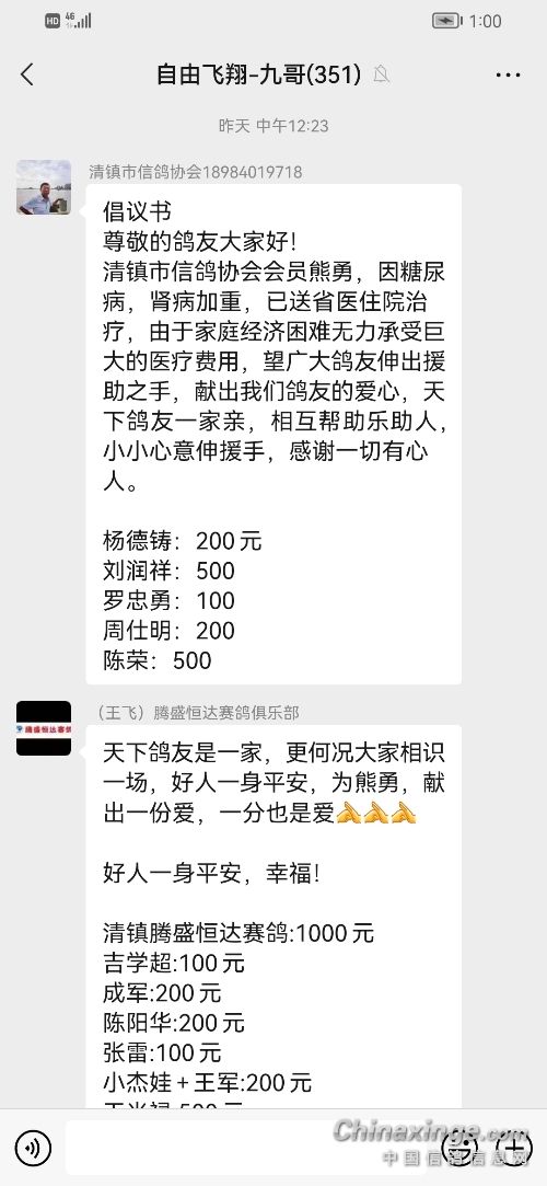 2021年12月28日,贵州清镇市几个信鸽群发出了一份捐款倡议书,倡议书里面详细介绍了清镇鸽友熊勇身染重病,由于家庭经济困难无力承受高额的医疗费用,望广大鸽友伸出援助之手,在清镇市鸽会刘主席、贵州清镇腾盛恒达赛鸽俱乐部老板王飞和贵州清镇湖城赛鸽俱乐部老板顾荣焦明芳号召下:群里的鸽友们纷纷解囊相助。