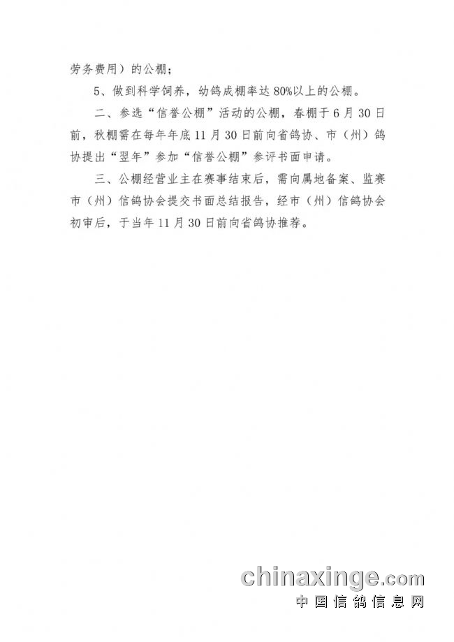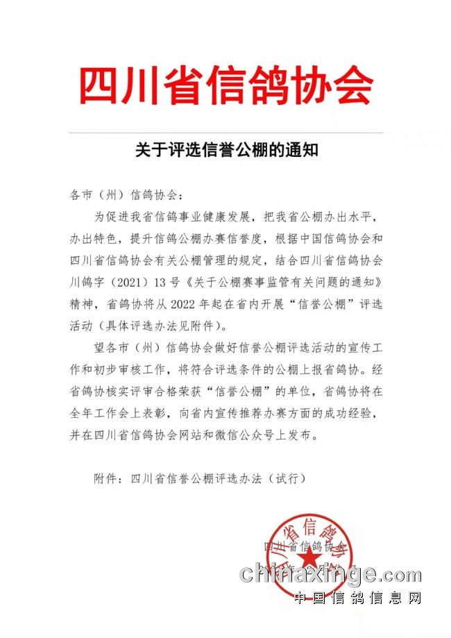12月30日,四川省信鸽协会发出《关于评选信誉公棚的通知》,宣布为促进四川省信鸽事业健康发展,把四川省公棚办出水平,办出特色,提升信鸽公棚办赛信誉度,根据中国信鸽协会和四川省信鸽协会有关公棚管理的规定,结合四川省信鸽协会川鸽字(2021)13 号《关于公棚赛事监管有关问题的通知》精神,四川省鸽协将从2022年起在省内开展“信誉公棚”评选活动。望各市(州)信鸽协会做好信誉公棚评选活动的宣传工作和初步审核工作,将符合评选条件的公棚上报省鸽协。经省鸽协核实评审合格荣获“信誉公棚”的单位,省鸽协将在全年工作会上表彰,向省内宣传推荐办赛方面的成功经验,并在四川省信鸽协会网站和微信公众号上发布。