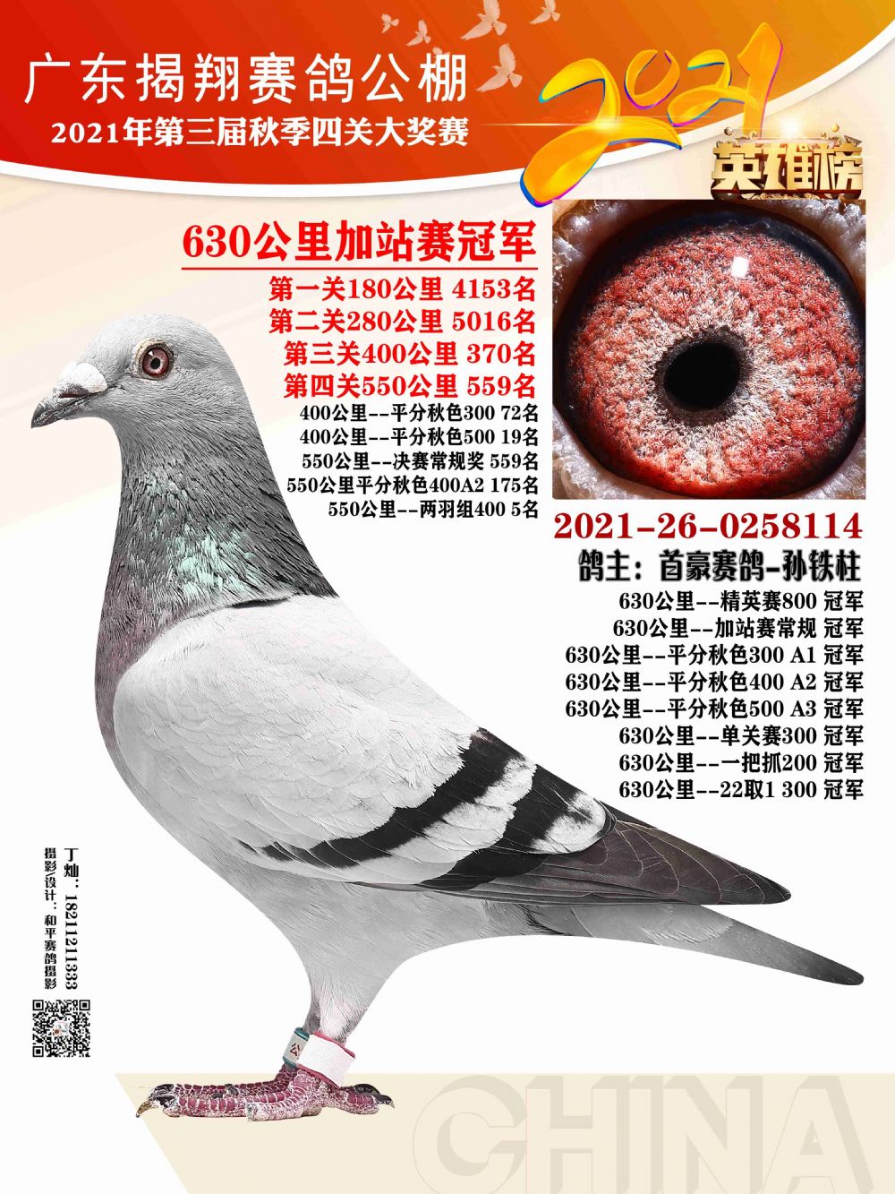 2.2021年12月4日,广东揭翔公棚举行630公里的加战赛,3856羽同场竞技,算得上是大羽数了。冠军被鸽主首豪赛鸽-孙铁柱的2021-26-0258114灰鸽以1474.4859米/分的分速拿下,并赢得众多指定大奖。在飞完前四关近一千五百公里的空距之后,还能战出如此分速,值得点赞。