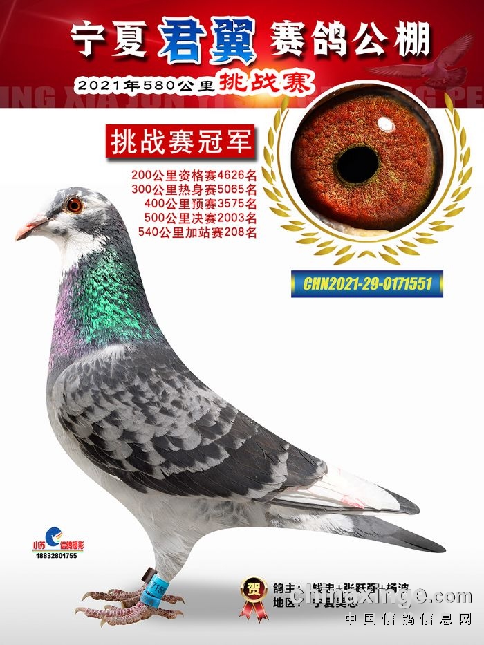 3.在宁夏君翼580公里的加战赛中,鸽主钱忠+张跃强+杨波的2021-29-0171551赛鸽以1139.783米/分的分速拿下冠军。这羽赛鸽从资格赛的4626名到决赛2003名都不被人看好,最后一战成名获得加战赛冠军,看来不到最后一刻,胜负都是未知啊。
