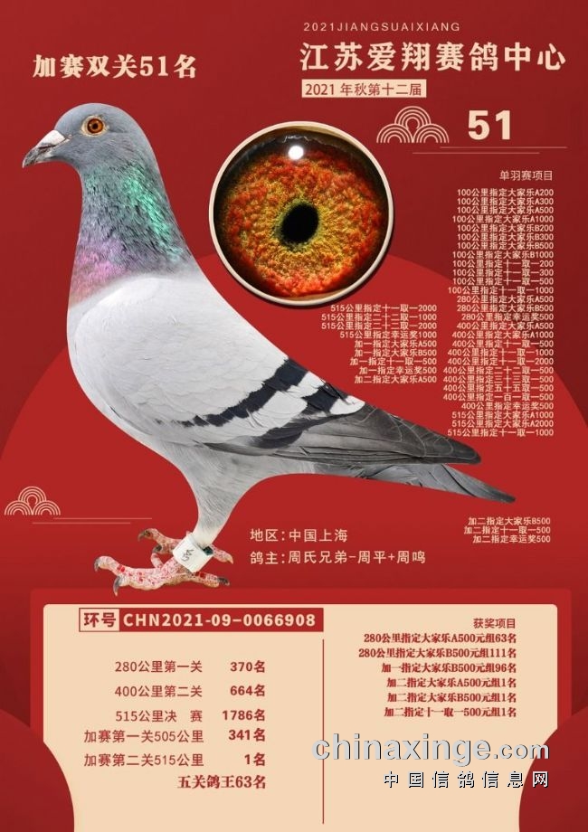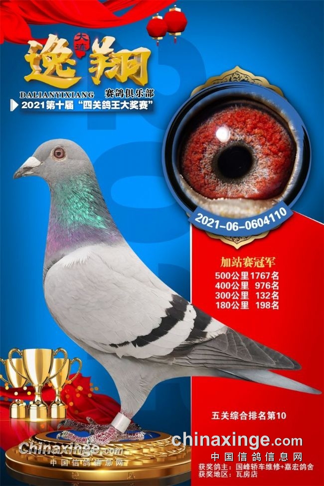 13.大连逸翔赛鸽俱乐部2021年加战赛中,鸽主:国峰轿车维修+嘉宏鸽舍的一羽2021060604110灰鸽,以1328.46米/分的分速,在竞赛的3029羽赛鸽中脱颖而出,拿下冠军。这羽赛鸽在第一、二关的时候发挥良好,也许是三、四关体力少有不支,但整体能力还是较为优秀。在五关综合中排名第十,也算是没有辜负主人的期待。查看获奖鸽图片>>