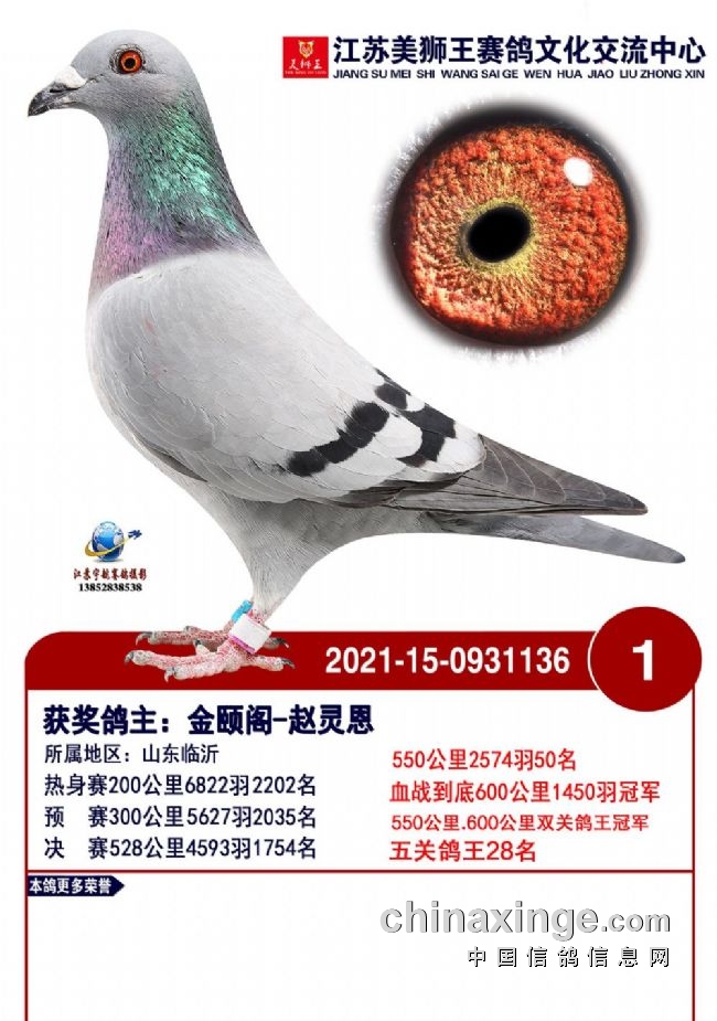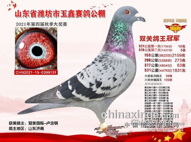 16.山东省潍坊玉鑫赛鸽公棚加战赛双关鸽王冠军,由冠美国际-卢念明作育,环号2021150399131。在521公里第一关拿下第十名、576公里第二关中拿下第5名,同时还获得六关名次鸽王的第58名。这羽赛鸽在前几轮的发挥并不稳定、时高时低,但也正因为如此,经过了前几轮的历练之后,它的能力开始显现,在两关加战赛中都取得了不错的成绩。查看获奖鸽图片>>