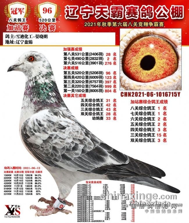 6.雪迪化工-晏晓明的2021-06-1016715麒麟花在辽宁天霸公棚秋赛“血战到底”三关加战赛中,飞出六关276名、七关亚军、八关28名!不仅如此,这羽战鸽在八关赛事中的表现也是十分突出:获得七关、八关鸽王冠军,五关、六关鸽王亚军,双关、四关鸽王季军等多项鸽王头衔。最终在拍卖会上,也以超高价格成交。