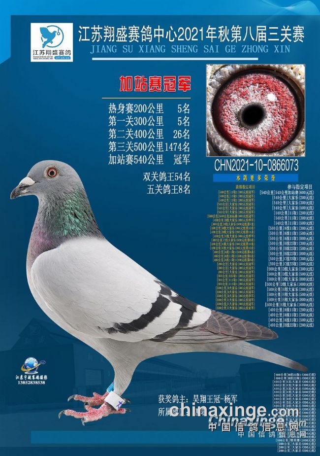 7.在江苏翔盛赛鸽中心第八届三关赛的加战赛中,鸽主昊翔王冠-杨军的一羽2021100866073灰鸽拿下冠军。不仅如此,这羽赛鸽在前几关表现也是相当出色:热身赛5名、第一关5名、第二关26名,同时还是双关鸽王54名、五关鸽王8名,可谓是关关快,更是众多指定加身,堪称大赢家。