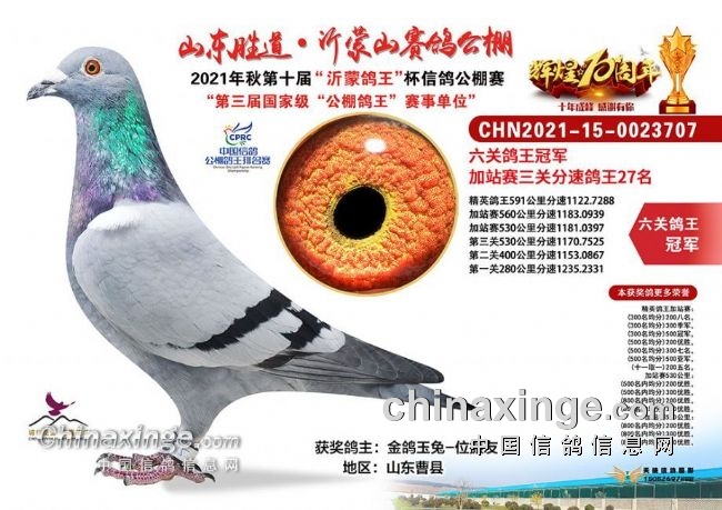 8.山东胜道·沂蒙山国际赛鸽公棚,在591公里的加战赛中,鸽友金鸽玉兔-位振友的一羽2021-10-0064578雨点,拿下六关鸽王冠军,这是一羽发挥相当稳定的赛鸽,在六关比赛中,每一关都能保证分速在1100米/分之上,除六关鸽王冠军之外,它还获得加战赛三关分速鸽王27名。鸽主对它也是相当重视,众多指定压身,是实打实的一羽好鸽。查看获奖鸽图片>>