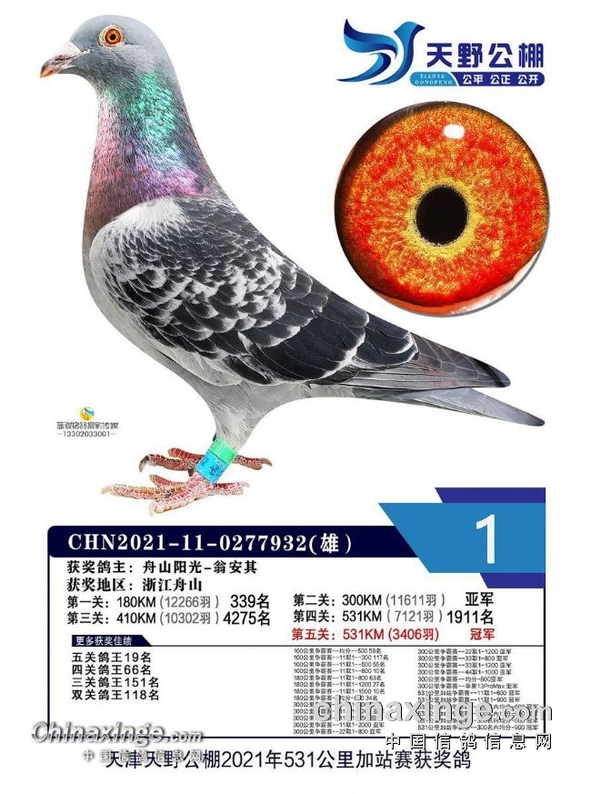 9.天津市天野公棚531公里加战赛中,鸽主舟山阳光-翁安其的一羽2021110277932雄鸽,在531公里的加战赛中拿下金牌,本关共有3406羽同场竞技,大羽数中拿第一不容易。这羽赛鸽在第一关万羽竞翔中拿下339名之后,第二关继续发力拿下亚军,只是三、四关力有不逮,再加战赛,它铆足劲,飞出冠军!获得五关鸽王19名、四关鸽王66名。查看获奖鸽图片>>