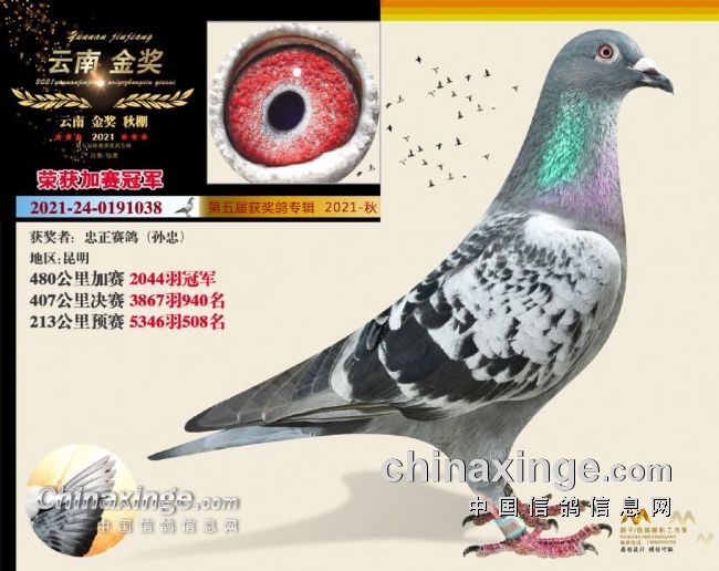 10.云南金奖公棚2021年480公里加战赛中,一羽2021240191038的赛鸽,在2044羽竞赛中夺下冠军,云南地形复杂、天气又多变,对于赛鸽来说是不小的挑战。在前几关赛事中,这羽赛鸽一直保持着千名以内,积蓄力量。在最后一关加战赛中,飞身夺冠、一举成名!查看获奖鸽>>