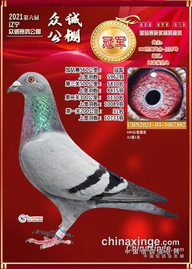 11.辽宁众诚赛鸽公棚第六届560公里加战赛中,5962羽同场竞技,从10733羽打到现在,在前几关大羽数的比赛中,这羽赛鸽第一关31名,第二关1130名,第三关稍有落后,最后在加战赛中拿下冠军,环号2021031067887的灰鸽,鸽主来自河北秦皇岛,000浩翔鸽舍-王开峰。查看获奖鸽图片>>
