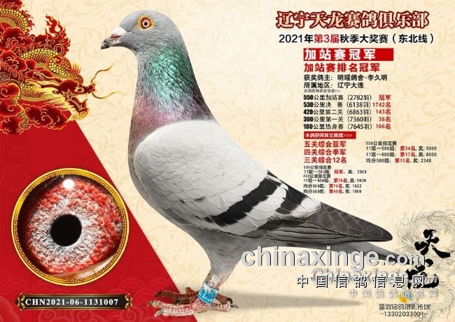 12.我们继续看到北方赛事的加战赛冠军:辽宁天龙赛格俱乐部。今年第三届秋季大奖赛,选择东北线竞翔,在550公里加战赛中,2782羽争夺第一。最后夺得冠军的是一羽2021061137007的灰鸽。这羽赛鸽眼睛炯炯有神,来自鸽主明瑶鸽舍-李久明。同时还是五关综合亚军、四关综合季军,也为鸽主赢得众多指定大奖,是一羽优秀的战将。查看获奖鸽图片>>