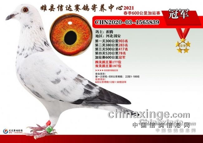 14.雄县信达寄养中心春季600公里加战赛中,来自河北固安的鸽友折腾出的一羽2020031565839白花,在五关赛事中稳扎稳打一路前进,从第一关300公里的903名到第四关520公里的78名,随着空距的拉长,这羽赛鸽开始显现出它的耐力。在空距最长的600公里中,这羽赛鸽终于拿下冠军,值得庆贺!查看获奖鸽图片>>