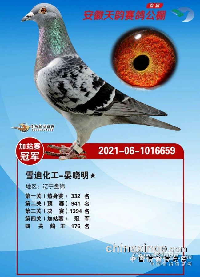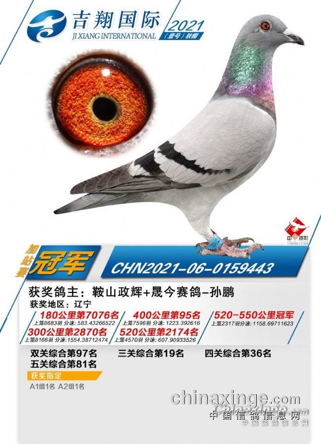 15.天津吉祥公棚520-550公里加战赛中,鸽主鞍山政辉+晟金赛鸽-孙鹏的一羽2021060159443灰鸽,在2317羽赛鸽中以1158.69米/分的分速拿下冠军,同时获得三关综合19名、四关综合36名,获得亮相指定,这羽赛鸽在第三关中也发挥不错,取得前百名的成绩。查看获奖鸽图片>>
