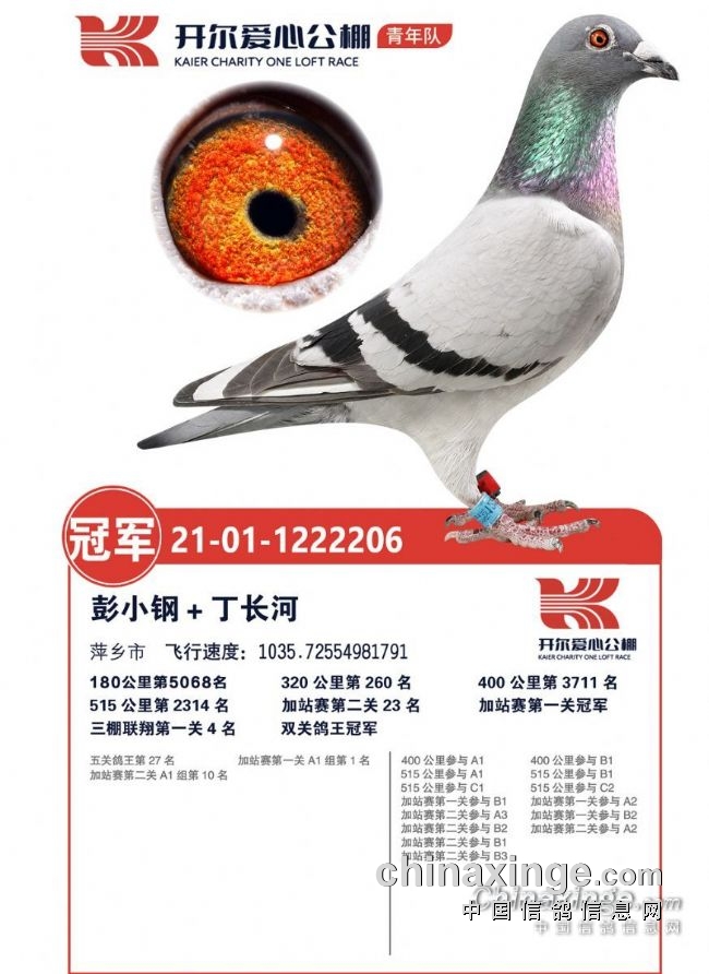 17.开尔爱心公棚青年队的名气不用多说,今年两关加战赛中,由鸽主彭小刚+丁长河作育的21011222206的灰鸽,获得加战赛双关冠军,同时还在开尔大棚、青年队、先锋队的三棚联翔中获得第4名,为鸽主赢得众多指定大奖,在拍卖会上,也拍出了不菲的价格。查看获奖鸽图片>>