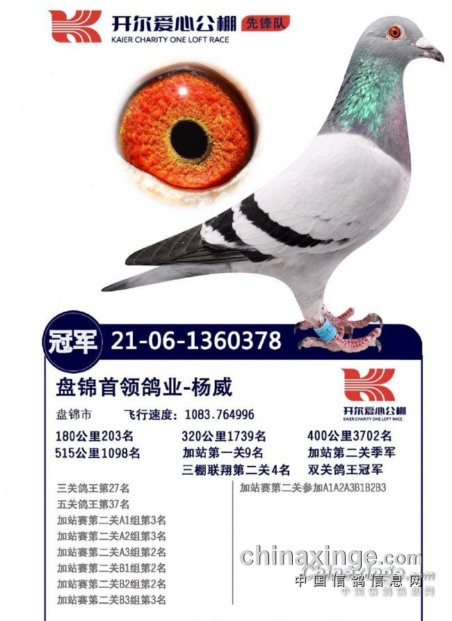 18.说完青年队,接下来我们来看看先锋队的比赛成绩。在开尔爱心公棚先锋队的加战赛中,由鸽主盘锦首领鸽业-杨威作育的21061360378的灰鸽,在第一关加战赛中获得第九名、第二关加战赛中更进一步荣获季军,紧接着,又在三棚联翔第二关中拿下第四名。鸽主布局及时,在加战赛第二关中给这只鸽子压下众多指定,果然它不负众望,拿下季军。查看获奖鸽图片>>