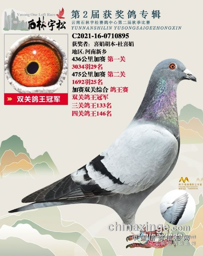 20.云南石林宇松2021年第二届赛事两关加战赛中,由鸽主喜娟胡本-杜喜娟作育的2021160710895,在第一关436公里加赛中拿下29名、第二关475公里加战赛中拿下25名,可以说是发挥比较稳定的一羽战鸽,在两关加战赛中,它拿下双关鸽王冠军,在三关鸽王中也取得了133名。是一羽不错的战鸽。查看获奖鸽图片>>
