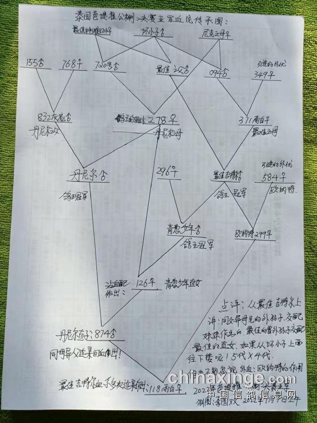 网上公布了决赛亚军的血统书,我把这个血统书画了出来,供同好们学习研究。