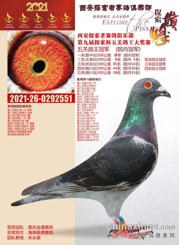 2021年令人印象深刻的鸽子,西安探索者的“黑皮神鸟”当仁不让!海燕雄鹰赛鸽的0292551黑皮神鸟,获得1关院内冠军、2关院内5名、3关院内54名、4关院内30名、5关院内35名,获得双关鸽王总冠军、三关鸽王总冠军、四关鸽王总冠军和五关鸽王总冠军,多重荣誉加身,四度夺下鸽王冠军,真正的神奇小鸟!而这羽神鸟也被中信网友以七位数高价拍得。