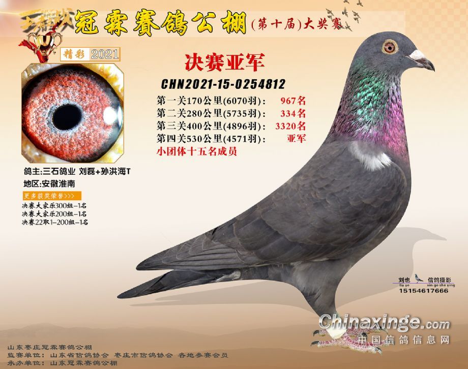 作为十年老公棚,山东冠霖今年秋赛,打得漂亮。7200羽正式封棚,随后进行10次训放,四关赛完还存有3449羽,关关高归巢。其中安徽鸽友三石鸽业刘磊+孙洪海的一羽2021-15-0254812“黑鸟”突破重围,斩获决赛亚军。