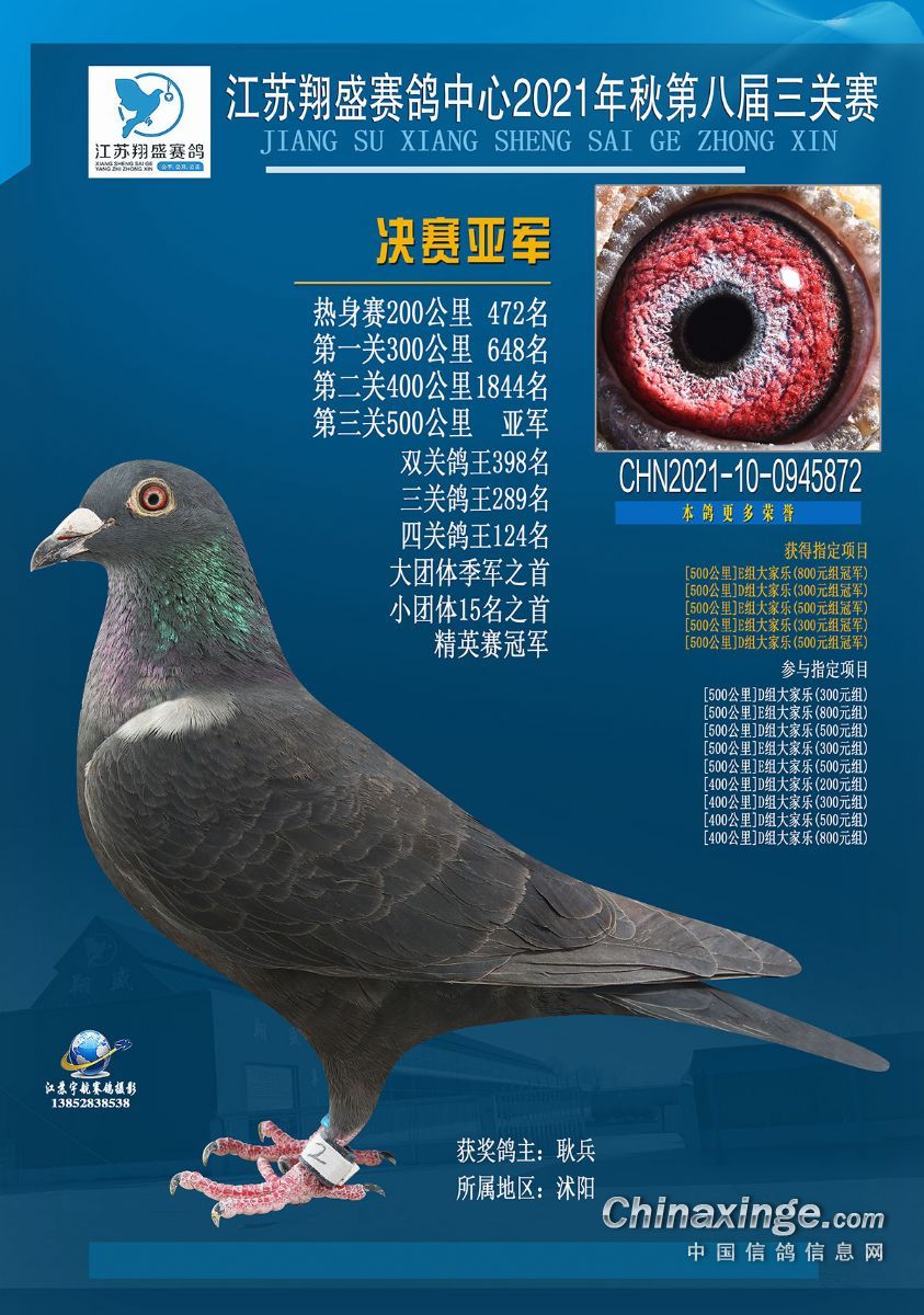 江苏瑞达国际赛鸽公棚(秋棚)2021年秋赛是首届,参赛费1600元/羽,饲养费200元/羽,打西北赛线,设三关赛。经过180公里热身赛、300公里速度赛、400公里半决赛、500公里决赛的层层洗礼,江苏镇江鸽友王晓航的一羽2021-10-0483563绛鸽勇夺决赛冠军,同时拿下三关鸽王季军,赢得汽车大奖。